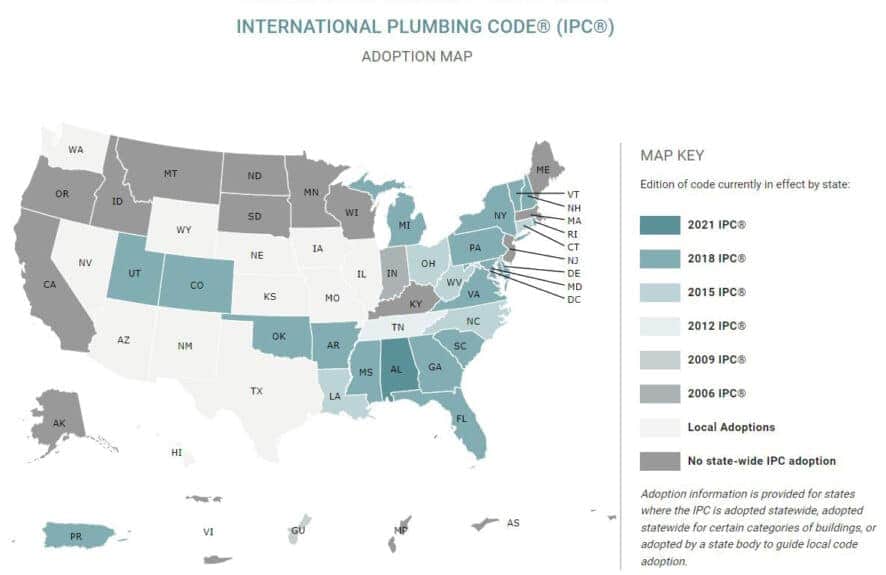 Currently, 37 states plus Washington D.C., Puerto Rico, and Guam have adopted some version of the IPC at the state or local level. As you can see from the image below, states are still using many different IPC editions for their adopted laws.